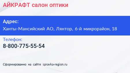 АЙКРАФТ, салон оптики по адресу Ханты-Мансийский АО, Лянтор, 6-й микрорайон, 18 в дальнейшем Организация, размещена в следующих категориях: