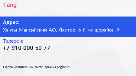 Tang по адресу Ханты-Мансийский АО, Лянтор, 6-й микрорайон, 9 в дальнейшем Организация, размещена в следующих категориях: