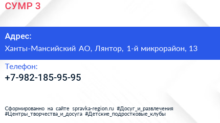 СУМР №3 по адресу Ханты-Мансийский АО, Лянтор, 1-й микрорайон, 13 в дальнейшем Организация, размещена в следующих категориях: