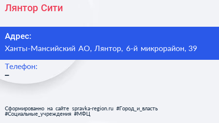 Лянтор Сити по адресу Ханты-Мансийский АО, Лянтор, 6-й микрорайон, 39 в дальнейшем Организация, размещена в следующих категориях:
