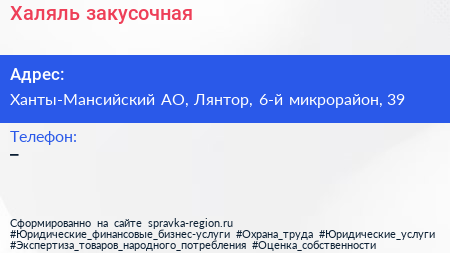 Халяль, закусочная по адресу Ханты-Мансийский АО, Лянтор, 6-й микрорайон, 39 в дальнейшем Организация, размещена в следующих категориях:
