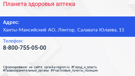 Планета здоровья, аптека по адресу Ханты-Мансийский АО, Лянтор, Салавата Юлаева, 15 в дальнейшем Организация, размещена в следующих категориях: