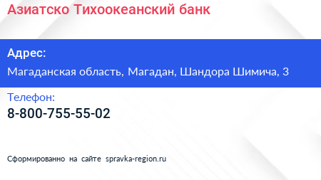 Азиатско-Тихоокеанский банк по адресу Магаданская область, Магадан, Шандора Шимича, 3 в дальнейшем Организация, размещена в следующих категориях: