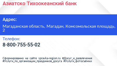 Азиатско-Тихоокеанский банк по адресу Магаданская область, Магадан, Комсомольская площадь, 2 в дальнейшем Организация, размещена в следующих категориях: