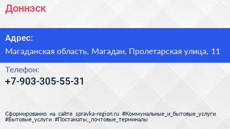 Доннэск по адресу Магаданская область, Магадан, Пролетарская улица, 11 в дальнейшем Организация, размещена в следующих категориях: