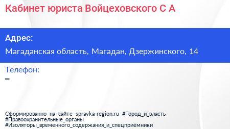 Кабинет юриста Войцеховского С.А. по адресу Магаданская область, Магадан, Дзержинского, 14 в дальнейшем Организация, размещена в следующих категориях: