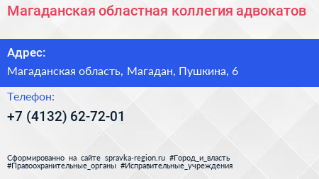 Магаданская областная коллегия адвокатов по адресу Магаданская область, Магадан, Пушкина, 6 в дальнейшем Организация, размещена в следующих категориях: