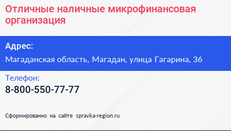 Отличные наличные, микрофинансовая организация по адресу Магаданская область, Магадан, улица Гагарина, 36 в дальнейшем Организация, размещена в следующих категориях: