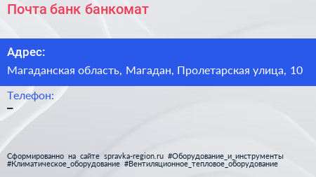 Почта банк, банкомат по адресу Магаданская область, Магадан, Пролетарская улица, 10 в дальнейшем Организация, размещена в следующих категориях: