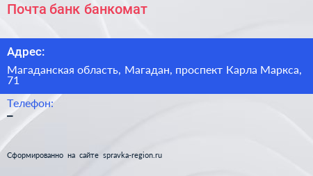 Почта банк, банкомат по адресу Магаданская область, Магадан, проспект Карла Маркса, 71 в дальнейшем Организация, размещена в следующих категориях: