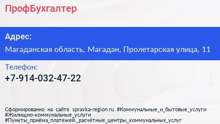 ПрофБухгалтер по адресу Магаданская область, Магадан, Пролетарская улица, 11 в дальнейшем Организация, размещена в следующих категориях: