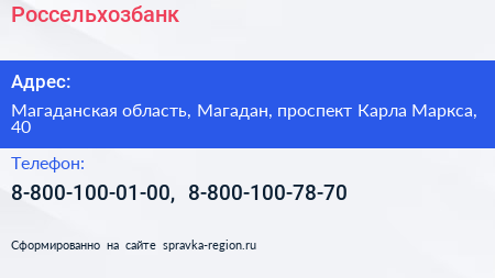 Россельхозбанк по адресу Магаданская область, Магадан, проспект Карла Маркса, 40 в дальнейшем Организация, размещена в следующих категориях: