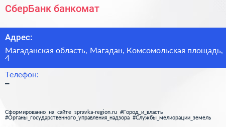 СберБанк, банкомат по адресу Магаданская область, Магадан, Комсомольская площадь, 4 в дальнейшем Организация, размещена в следующих категориях: