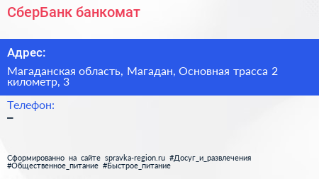 СберБанк, банкомат по адресу Магаданская область, Магадан, Основная трасса 2 километр, 3 в дальнейшем Организация, размещена в следующих категориях: