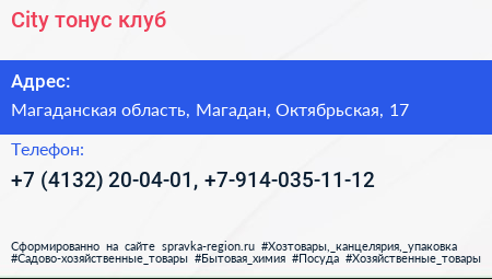 City-тонус, клуб по адресу Магаданская область, Магадан, Октябрьская, 17 в дальнейшем Организация, размещена в следующих категориях:
