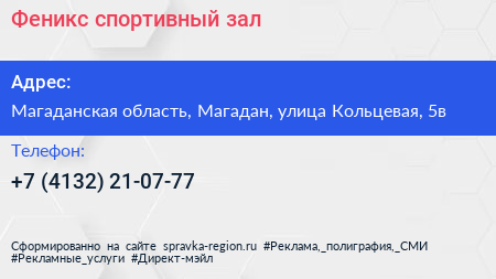 Феникс, спортивный зал по адресу Магаданская область, Магадан, улица Кольцевая, 5в в дальнейшем Организация, размещена в следующих категориях: