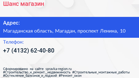 Шанс, магазин по адресу Магаданская область, Магадан, проспект Ленина, 10 в дальнейшем Организация, размещена в следующих категориях: