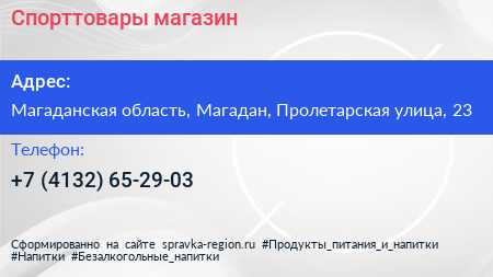 Спорттовары, магазин по адресу Магаданская область, Магадан, Пролетарская улица, 23 в дальнейшем Организация, размещена в следующих категориях:
