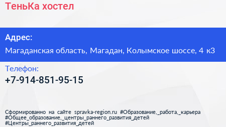 ТеньКа, хостел по адресу Магаданская область, Магадан, Колымское шоссе, 4 к3 в дальнейшем Организация, размещена в следующих категориях: