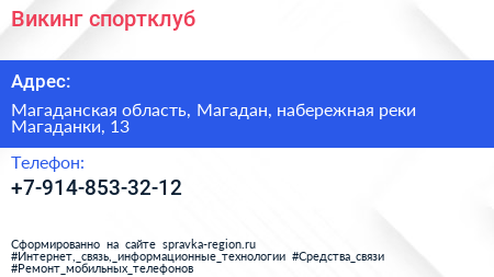 Викинг, спортклуб по адресу Магаданская область, Магадан, набережная реки Магаданки, 13 в дальнейшем Организация, размещена в следующих категориях: