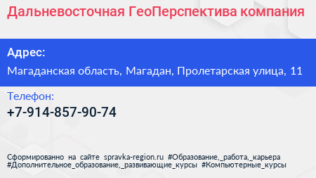 Дальневосточная ГеоПерспектива, компания по адресу Магаданская область, Магадан, Пролетарская улица, 11 в дальнейшем Организация, размещена в следующих категориях: