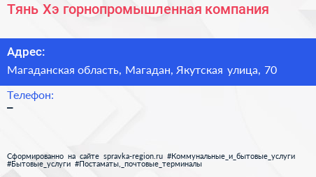 Тянь Хэ, горнопромышленная компания по адресу Магаданская область, Магадан, Якутская улица, 70 в дальнейшем Организация, размещена в следующих категориях: