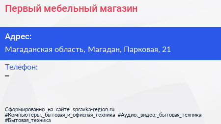 Первый мебельный, магазин по адресу Магаданская область, Магадан, Парковая, 21 в дальнейшем Организация, размещена в следующих категориях: