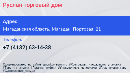 Руслан, торговый дом по адресу Магаданская область, Магадан, Портовая, 21 в дальнейшем Организация, размещена в следующих категориях: