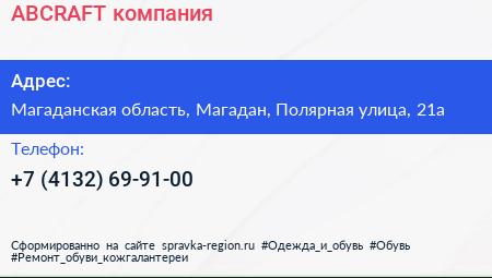 ABCRAFT, компания по адресу Магаданская область, Магадан, Полярная улица, 21а в дальнейшем Организация, размещена в следующих категориях: