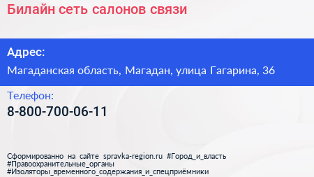 Билайн, сеть салонов связи по адресу Магаданская область, Магадан, улица Гагарина, 36 в дальнейшем Организация, размещена в следующих категориях: