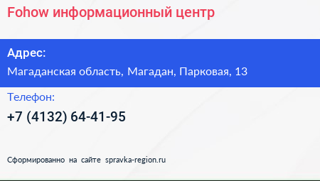 Fohow, информационный центр по адресу Магаданская область, Магадан, Парковая, 13 в дальнейшем Организация, размещена в следующих категориях: