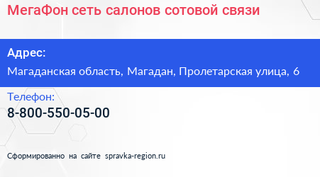 МегаФон, сеть салонов сотовой связи по адресу Магаданская область, Магадан, Пролетарская улица, 6 в дальнейшем Организация, размещена в следующих категориях: