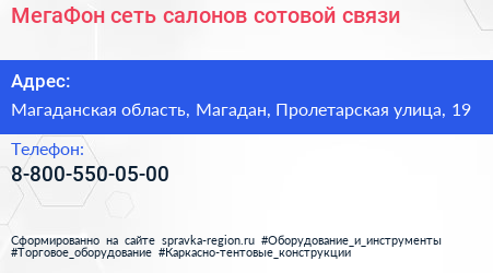 МегаФон, сеть салонов сотовой связи по адресу Магаданская область, Магадан, Пролетарская улица, 19 в дальнейшем Организация, размещена в следующих категориях: