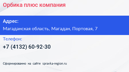 Орбика-плюс, компания по адресу Магаданская область, Магадан, Портовая, 7 в дальнейшем Организация, размещена в следующих категориях: