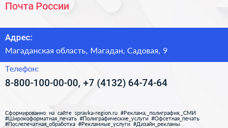 Почта России по адресу Магаданская область, Магадан, Садовая, 9 в дальнейшем Организация, размещена в следующих категориях: