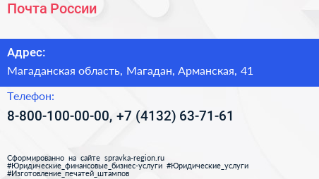 Почта России по адресу Магаданская область, Магадан, Арманская, 41 в дальнейшем Организация, размещена в следующих категориях: