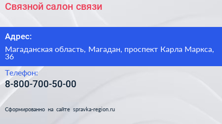 Связной, салон связи по адресу Магаданская область, Магадан, проспект Карла Маркса, 36 в дальнейшем Организация, размещена в следующих категориях: