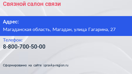 Связной, салон связи по адресу Магаданская область, Магадан, улица Гагарина, 27 в дальнейшем Организация, размещена в следующих категориях: