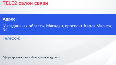 TELE2, салон связи по адресу Магаданская область, Магадан, проспект Карла Маркса, 31 в дальнейшем Организация, размещена в следующих категориях: