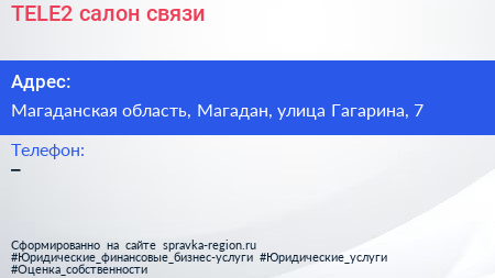 TELE2, салон связи по адресу Магаданская область, Магадан, улица Гагарина, 7 в дальнейшем Организация, размещена в следующих категориях: