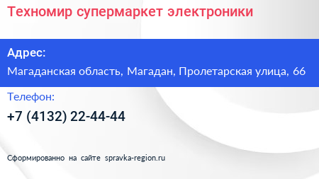 Техномир, супермаркет электроники по адресу Магаданская область, Магадан, Пролетарская улица, 66 в дальнейшем Организация, размещена в следующих категориях: