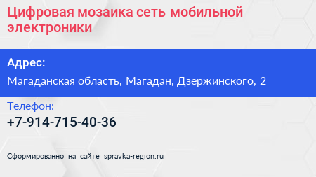 Цифровая мозаика, сеть мобильной электроники по адресу Магаданская область, Магадан, Дзержинского, 2 в дальнейшем Организация, размещена в следующих категориях: