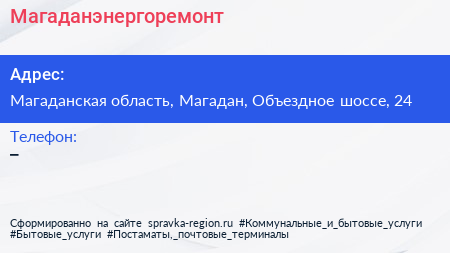 Магаданэнергоремонт по адресу Магаданская область, Магадан, Объездное шоссе, 24 в дальнейшем Организация, размещена в следующих категориях: