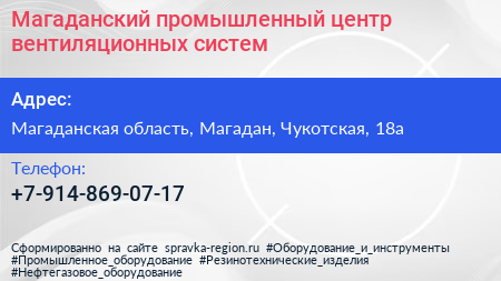 Магаданский промышленный центр вентиляционных систем по адресу Магаданская область, Магадан, Чукотская, 18а в дальнейшем Организация, размещена в следующих категориях: