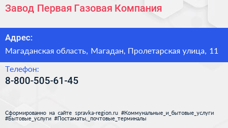 Завод Первая Газовая Компания по адресу Магаданская область, Магадан, Пролетарская улица, 11 в дальнейшем Организация, размещена в следующих категориях: