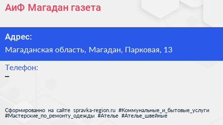 АиФ Магадан, газета по адресу Магаданская область, Магадан, Парковая, 13 в дальнейшем Организация, размещена в следующих категориях: