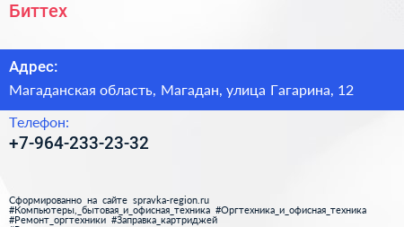 Биттех по адресу Магаданская область, Магадан, улица Гагарина, 12 в дальнейшем Организация, размещена в следующих категориях: