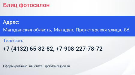Блиц, фотосалон по адресу Магаданская область, Магадан, Пролетарская улица, 86 в дальнейшем Организация, размещена в следующих категориях: