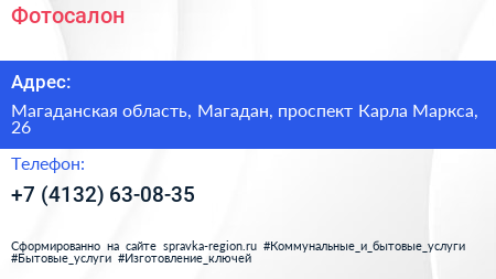 Фотосалон по адресу Магаданская область, Магадан, проспект Карла Маркса, 26 в дальнейшем Организация, размещена в следующих категориях: