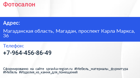 Фотосалон по адресу Магаданская область, Магадан, проспект Карла Маркса, 36 в дальнейшем Организация, размещена в следующих категориях: